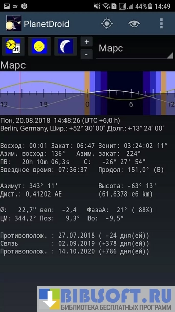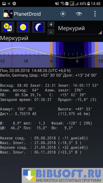 PlanetDroid - приложение, отображающее точные данные о небесных телах в реальном и указываемом времени. Узнавайте точное время восхода или заката Солнца с информацией о угле азимута. Используйте режим расширенной реальности и смотрите на детализированное звёздное небо через камеру устройства.