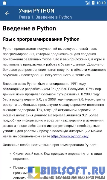 Учим ПИТОН.PY — образовательная платформа на Android для самостоятельного обучения программированию на популярном языке Python. Курс представляет собой сборник полезных материалов по разработке сайтов и созданию искусственного интеллекта. Уроки представлены в виде информативных лекций с описанием практических примеров по темам. Подача материала организована простым и доступным языком даже для новичка, который впервые сталкивается с понятиями «синтаксис» и «функции».