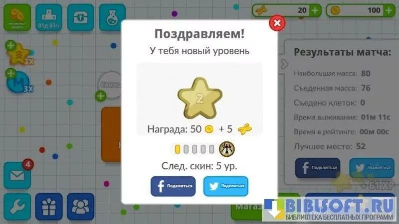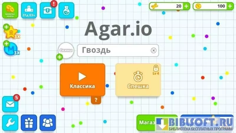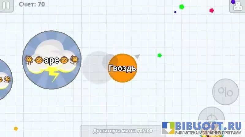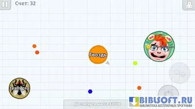 Agar.io – красочная минималистичная игра для Android, цель которой вырастить огромную клетку. Игровое поле представляет собой листок тетрадки. Вы стартуете в роли маленькой клетки живого организма, для увеличения массы и объема нужно поглощать другие клетки на игровой карте. Большие клетки поглощают меньшие, слишком большие могут разделяться на несколько меньших и соединяться обратно. Внешний вид клетки можно изменить, купив для этого скин, в игровом магазине. Кроме внешнего вида в магазине доступны стартовые бонусы и полезные зелья для быстрого развития. Управление клеткой довольно простое, клетка движется за движением пальца по экрану. Чем больше масса клетки, тем больше монет и опыта в награду. В игровой статистике на главном экране отображается максимально собранная масса, количество съеденных клеток, время выживания на карте и лучшее место в рейтинге.