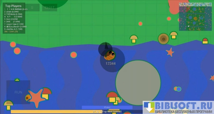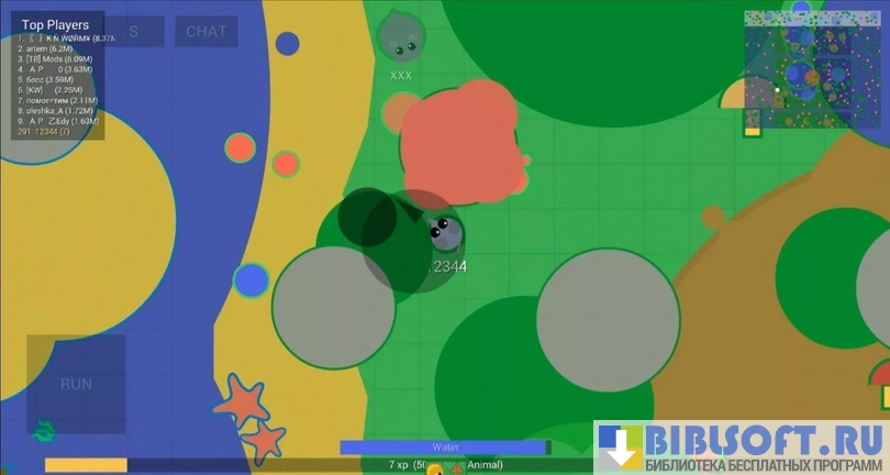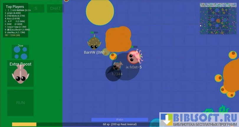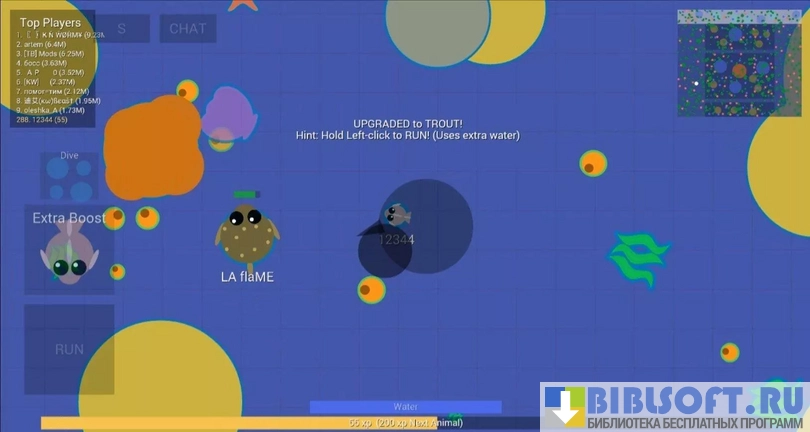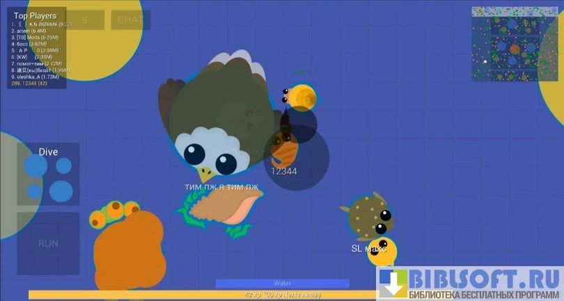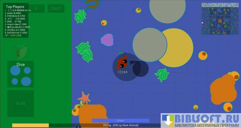 Всего добавлено более 20 видов существ, разбитых на 16 уровней - от мелких зайчат до огромных чёрных драконов. По карте разбросана различная еда, но съесть можно только то, что обведено в ярко-зелёный цвет. В начале съедобны ягоды и планктон. Набрав определённую массу, прокачиваемся в существо уровнем выше и разнообразие пищи становится шире. Съедобны и другие игроки, обведённые в ярко-зелёный контур, но на вас также могут охотиться. Стать добычей можно для тех, кто обведён в красный контур и придётся начинать заново. По локации расположены норы, в которые можно спрятаться в случае опасности. Специальные умения помогут в охоте на других игроков, ведь у каждого животного оно уникальное.