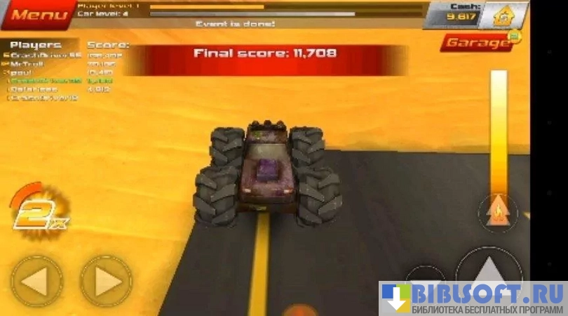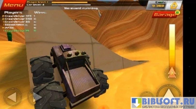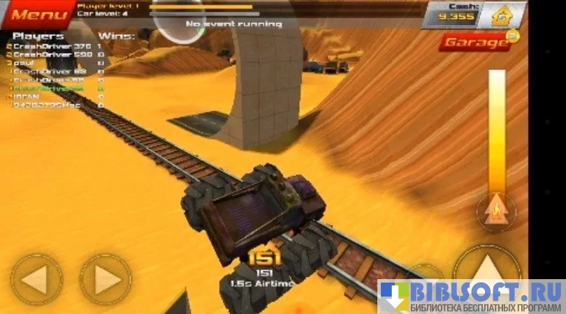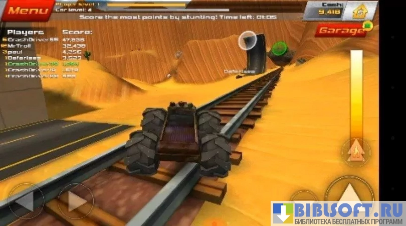 Crash Drive 2 – динамичный многопользовательский гоночный симулятор для Android, выполненный в превосходной трехмерной графике. Вас ожидают сумасшедшие гонки на выживание по различным трассам с многочисленными трюками. Удачно выполнив трюк, например, прыжок с трамплина, вы получите вознаграждение и сможете повысить уровень своего автомобиля. Характеристики автомобиля улучшаются после прохождения контрольных точек. Изначально пользователям на выбор предлагаются 3 автомобиля со средними характеристиками, но по мере накопления опыта и повышения уровня становятся доступными более 30 видов транспортных средств: