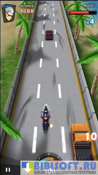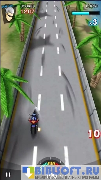 Racing Moto – почувствуйте себя байкером на своем Android. Незамысловатая игра, в которой нужно кататься на байке по автобану. Графика в игре двухмерная, вид на трассу организован сверху, немного позади байка. Шоссе имеет 3 полосы движения, разделенные белыми пунктирными линиями и ограниченные бордюрами с обеих сторон. Окружение вокруг шоссе постоянно меняется: сначала это пальмовое побережье, потом скоростной тоннель, дальше мост через реку. Это придает игре динамичности и реалистичности движения.