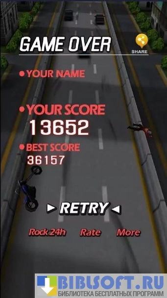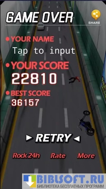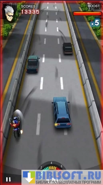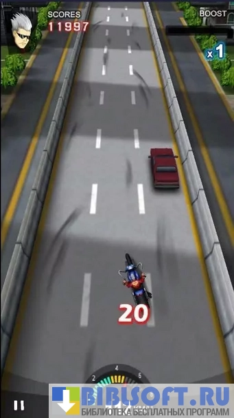 Цель в игре проехать по трассе, как можно дальше и быстрее. За время, проведенное на трассе и за обгон машин насчитываются очки. Набранное количество очков отображается в верхнем левом углу экрана, там же находится и иконка персонажа. Внизу экрана расположен датчик спидометра. Когда скорость байка достигает максимальной отметки, включается режим «буста» - умножения очков. Множитель отображается в верхнем правом углу экрана.