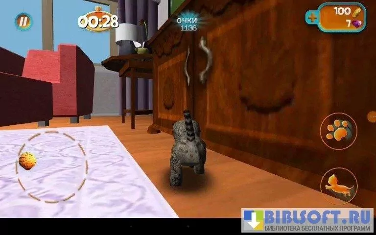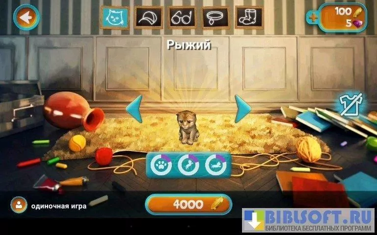 В начале игры пользователю предлагается выбрать животное, которое стоит определенное количество золотых монет. Кроме всем привычных пород в приложении рысь, тигр и даже черная пантера. В магазине можно купить красочную одежду для кота: кепки, очки, ошейники или обувь.