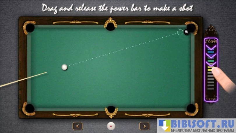 Играйте против компьютера со стандартными 8 шарами или 9 шарами. Коснитесь экрана, чтобы настроить направление и перетащить питание в ПРАВО для удара. Нажмите и удерживайте в любой точке, чтобы переместить биток и нажмите, чтобы выбрать свободный шар.