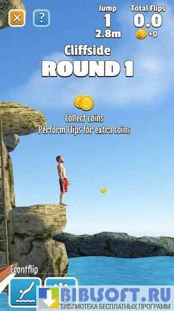 Flip Diving – игра для Android, имитирующая спортивные прыжки в воду. Игра интересна тем, что набор спортсменов достаточно своеобразен: от накаченного культуриста до бизнесмена в строгом костюме. Физика полета и погружения в воду каждого из участников прописана отдельно. Нужно пытаться не разбиться об скалы и идеально войти в воду!