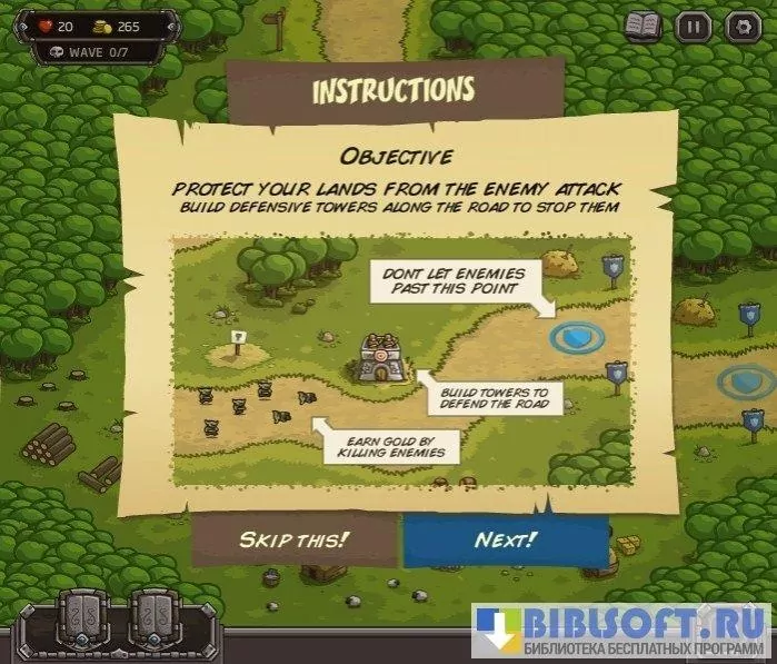 Цель игры – защитить город от монстров, движущихся по дороге к нему, с помощью защитных башен. С каждым новым уровнем усложняется выполнение поставленной задачи (сокращается время на миссию и увеличивая количество и сила монстров). Полученный за каждую миссию опыт можно направить на развитие защитных башен.