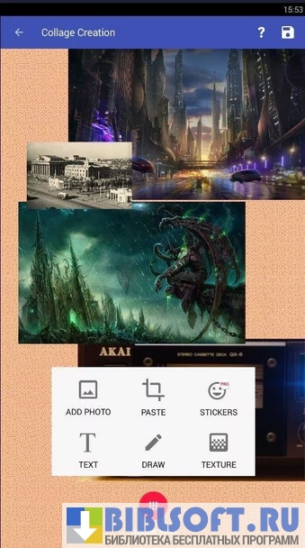 - в программу входит редактор фотографий в стиле коллаж, где вы можете вставлять фотографии из различных источников и добавлять текст. Программа позволяет создавать коллажи произвольной формы;