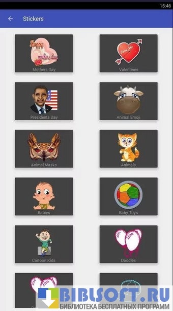 - фотостикеры - одна из важных частей приложения. Программа содержит более 400+ стикеров в категориях: смайлики животных, маски для лица, детские стикеры и стикеры в честь праздничных событий;