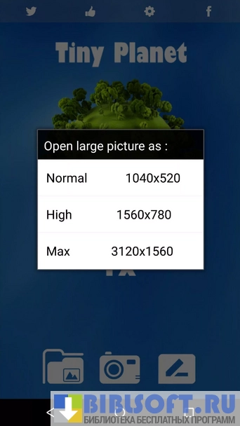 Tiny Planet Fx Pro – фоторедактор для Android, позволяющий создавать из двухмерных фотографий трехмерные панорамы, изображения с эффектом «фишай» и «планетарные» картинки. Утилита не требует навыков редактирования графических файлов.
