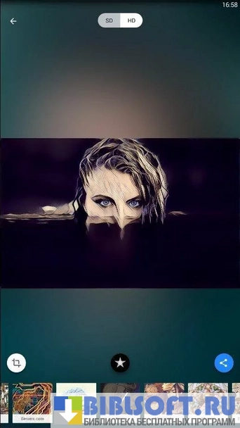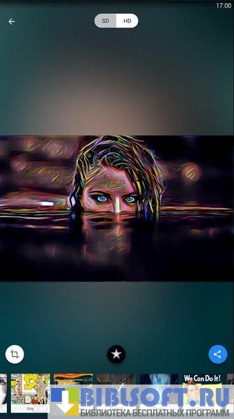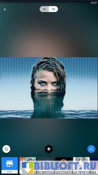 Программа предлагает множество фильтров, основанных на известных картинах (например «Крик» Эдварда Мунка). После применения фильтра можно уменьшить или увеличить его интенсивность, проведя пальцем по экрану влево. После этого отредактированную фотографию нужно сохранить в Галерее или Загрузках.