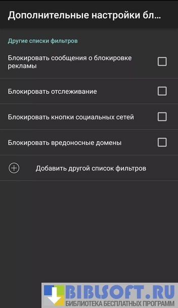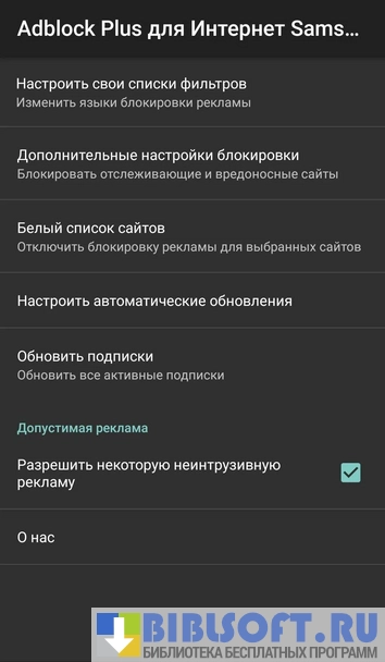 Adblock Plus - браузерный «блокировщик рекламы» для Android. Сканирует страницы веб-ресурсов, определят рекламные фрагменты веб-кода и предотвращает их загрузку. Отклоняет геолокационные и прочие «цифровые обращения» со стороны сайтов, позволяющие идентифицировать пользователя.