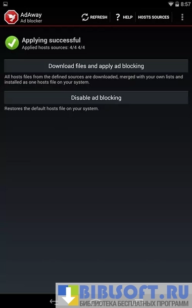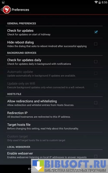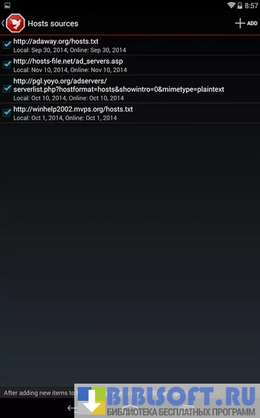 - Автоматическое обновление базы. Со временем появляются новые виды рекламы, поэтому приложение регулярно загружает файлы со списками хостов. Они устанавливаются в операционной системе смартфона;