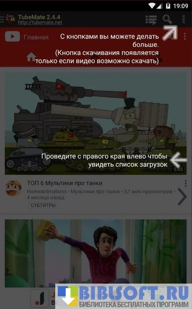TubeMate YouTube Downloader – простое и удобное приложение для скачивания видеороликов с YouTube для Android, предлагающее пользователям широкий выбор возможностей. В меню есть поисковая строка, куда нужно ввести название видео. При нажатии кнопки в виде зеленой стрелки в правом верхнем углу, будут предложены доступные варианты качества видеоролика.