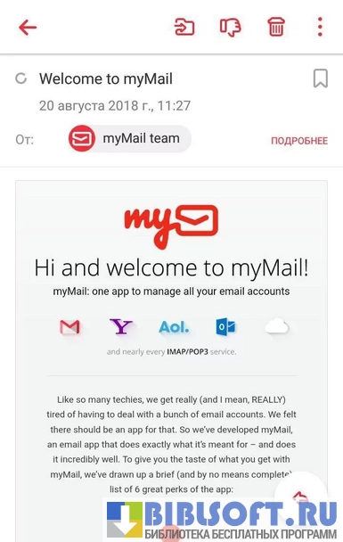 MyMail – многофункциональный почтовый клиент для Android. Поддерживает возможность синхронизации с большинством почтовых сервисов использующих IMAP-/POP3-/SMTP-протокол, в т.ч. – Gmail, Hotmail, iCloud, Mail.Ru, Outlook.com, Yandex, Yahoo и Rambler.