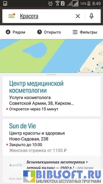 - Списки заведений находящихся поблизости рассортированы на удобные рубрики;