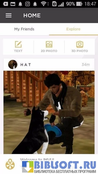 Далее пользователь может начать создавать посты, используя кнопку Text. Пользуясь списком опций IMVU, доступным слева, в верхней строчке программы, можно выбрать функцию чата и далее подобрать интересную пользователю ветку обсуждения, зайдя в «комнату» и присоединяясь к остальным участникам разговора. Там же есть такие опции, как: