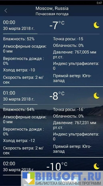 - Ежечасные обновления погоды;