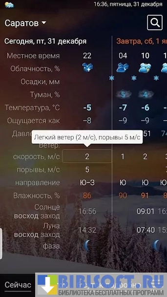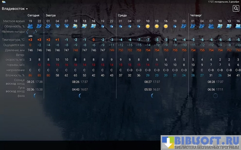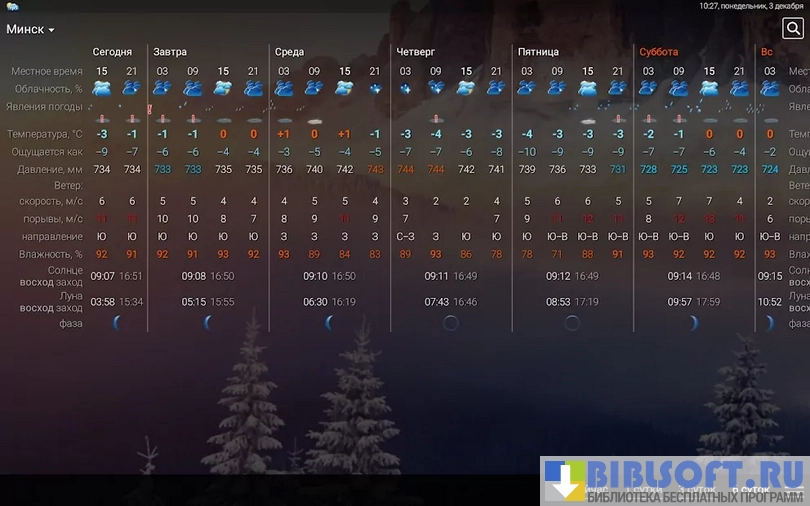 - Красивый интерфейс. Создатели программы смогли сделать просмотр прогноза погоды приятным занятием. Перед пользователем появляются горные, морские и лесные пейзажи в зависимости от метеорологических условий. Вверху находится крупная надпись, обозначающая температуру за окном. Ниже приводится информация о влажности воздуха, скорости ветра и атмосферном давлении;