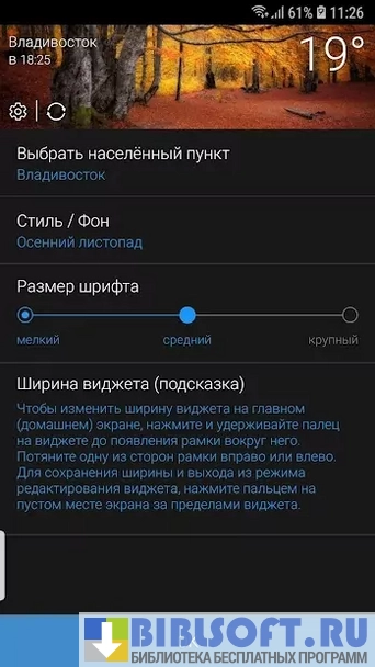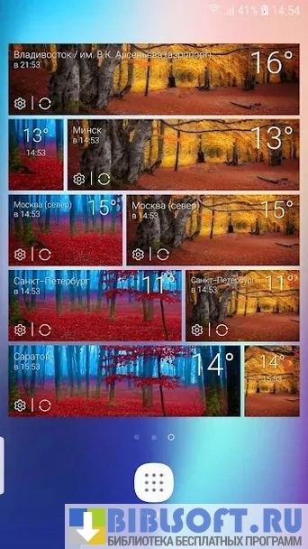 - Установка виджета. Чтобы не открывать приложение слишком часто, рекомендуется установить виджет на рабочий стол. Он позволяет просматривать прогноз погоды в реальном времени. Имеется возможность выбора размера виджета — мелкий, средний и крупный;