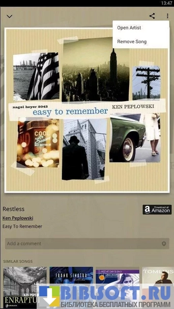 - После идентификации трека программа выдает ссылки на клипы исполнителя на Youtube, список похожих исполнителей и их песен в данном жанре.