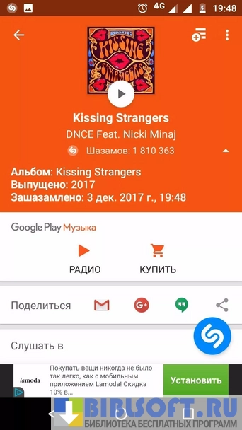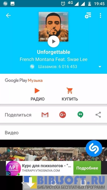 - в течение нескольких секунд программа распознает мелодию;