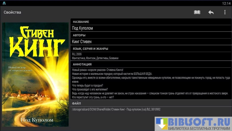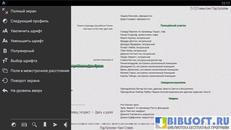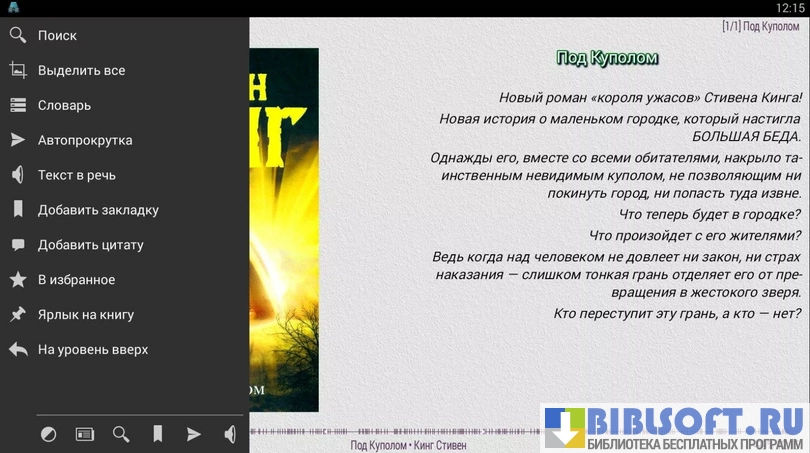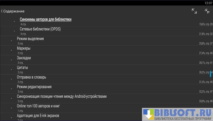 - отображение строки состояния со временем, количеством страниц, процентом прочитанного и уровнем заряда аккумулятора (можно скрыть в полноэкранном режиме);