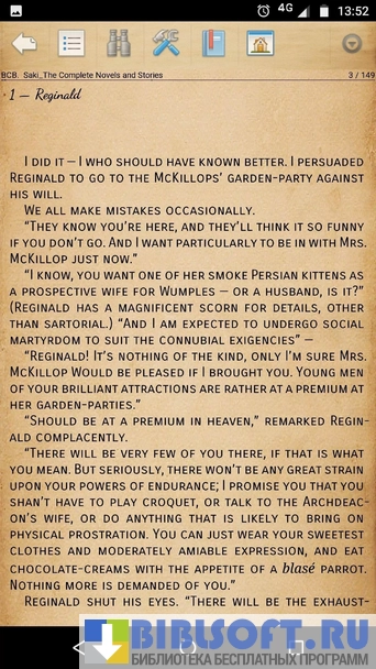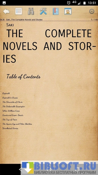 При открытии программы на экране гаджета по умолчанию отражаются все доступные файлы, содержащие текст и электронные книги. В верхней части экрана всегда видны название произведения, время, порядковый номер открытой страницы и процент зарядки. Перелистывание страниц вперед осуществляется легким касанием правой стороны экрана, а назад — левой.