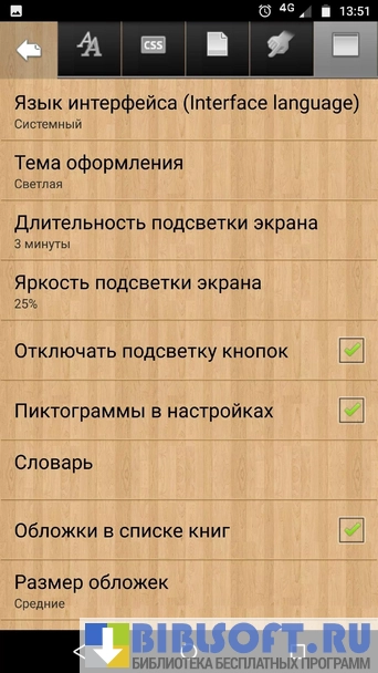 Настройки читалки можно изменять, например, сортировать книги по названию, автору, времени загрузки файла (по возрастанию или убыванию). В программе доступна функция автолистания, содержание, список предыдущих просмотренных или прочитанных книг. Нужные страницы можно добавлять в закладки. При выделении текста его легко скопировать, перевести в словаре, добавить свой комментарий или даже внести исправления, отправить выделенную цитату пользователям соцсетей или поделиться ей с помощью электронной почты, текстового сообщения или популярных мессенджеров, установленных на устройстве. Шрифт и межстрочные интервалы также меняются в зависимости от предпочтений пользователя. Он же выбирает и режим просмотра, ориентацию страницы (альбомная или книжная), цвет текста, фон и его текстуру (имитация станиц старой книги, мелованная бумага, металл, дерево и т.д.), режим чтения (ночной или дневной). Ночной режим подходит не только для чтения книг в темное время суток, но и для экономии заряда батареи во время использования устройства при ярком солнечном освещении.