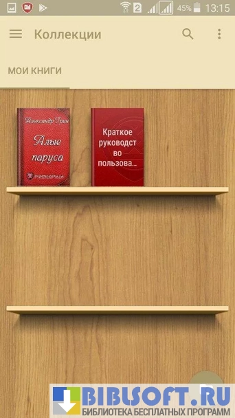 Для удобства пользования читалкой и доступа к онлайн библиотеке программа срезу предлагает создать учетную запись или зайти с помощью одного из существующих аккаунтов Google или соцсетей. На главной странице, оформленной в виде книжных полок, есть значок, состоящий из трех коротких линий — его нажатие открывает доступ к настройкам, темам, каталогу, магазину, избранным книгам и облачному хранилищу. Здесь же находится функция сканирования.