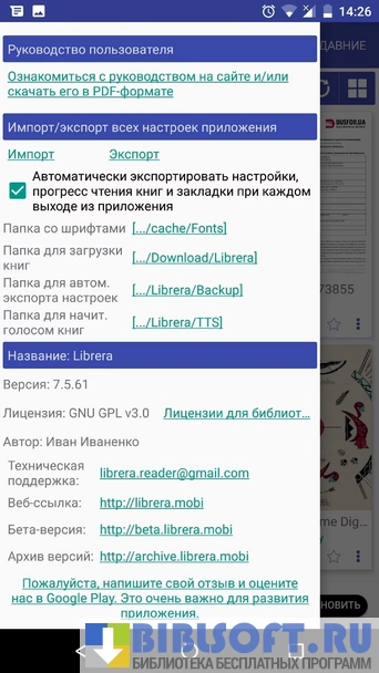 При всей богатой функциональности, программа требует всего два разрешения: для доступа к книгам и в Интернет. На фоне прочих аналогичных приложений Librera выгодно выделяется и заслуженно признана одной из лучших «читалок» для платформы Android.