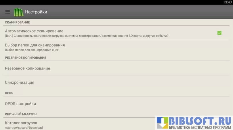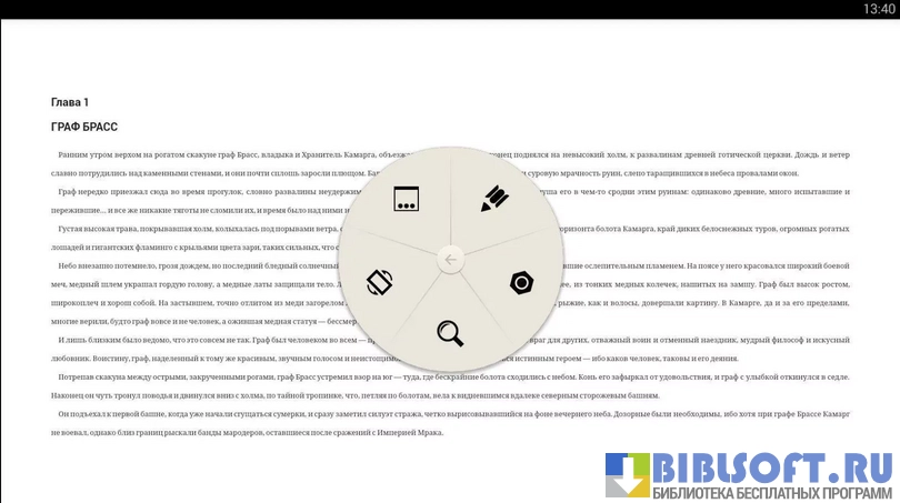 Приложение имеет 3 режима чтения: одностраничный, книжный и режим «свиток», в каждом из которых пользователь может листать страницы движением по экрану или кнопками громкости. Функция поиска позволяет найти страницу или абзац по введенному слову, а при помощи заметок можно выделить нужное место маркером или комментарием. Все созданные заметки экспортируются в файл и при последующем открытии файла они снова будут отображены.
