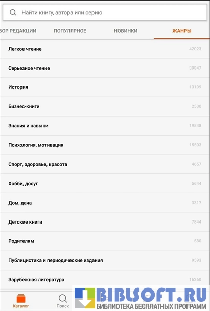 Оснащен гибко-настраиваемым фильтрами жанрово-тематических категорий, позволяющим оперативно найти нужный тип литературного контента – начиная от бестселлеров или классических произведений, и заканчивая техническими справочниками или сборниками кулинарных рецептов конкретных народов мира.