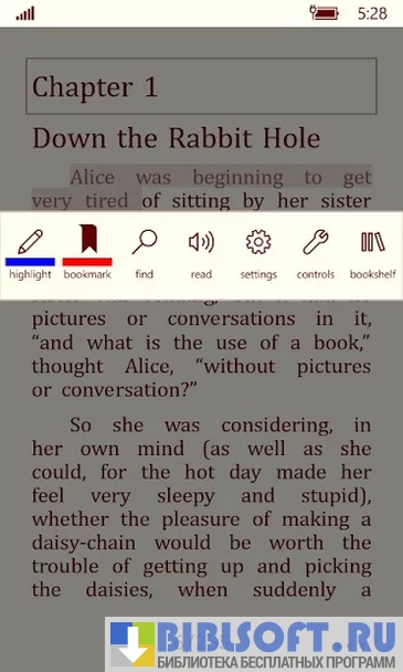 - Создание закладок. По умолчанию книга открывается с места остановки, поэтому добавлять запоминать номер страницы после чтения не нужно. Но если читатель хочет вернуться к приятным моментам, можно добавить закладку. Она сохраняется во встроенной памяти приложения и позволяет быстро переходить к нужной главе книги.