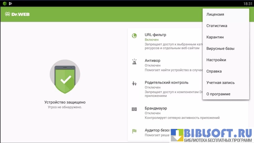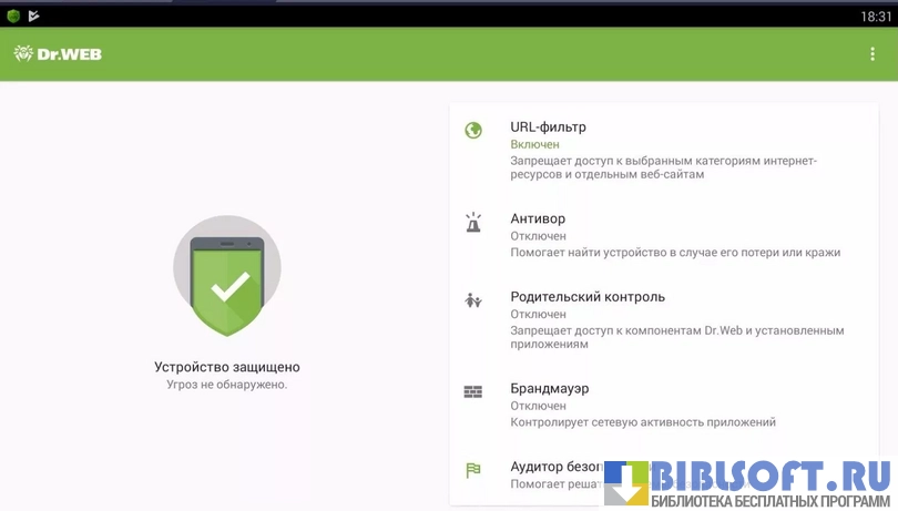 - аудитор безопасности, сканирующий устройство на наличие вирусных угроз и повышающий безопасность пользования смартфоном или планшетом, работающих на OS Android.