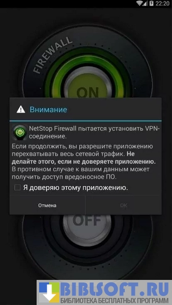 NetStop Firewall – брандмауэр для Android устройств, в основе которого лежит концепция радикальной блокировки всего поступающего трафика в один клик. Использует VPN-подключения к удаленному межсетевому фильтру, позволяющему остановить загрузку любых данных.