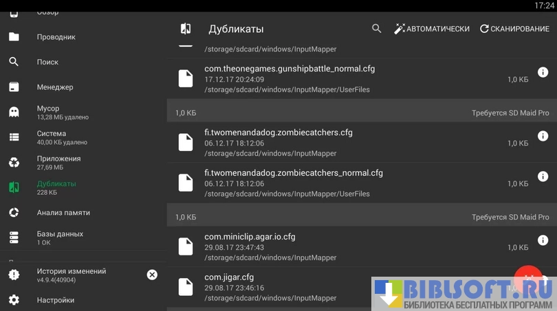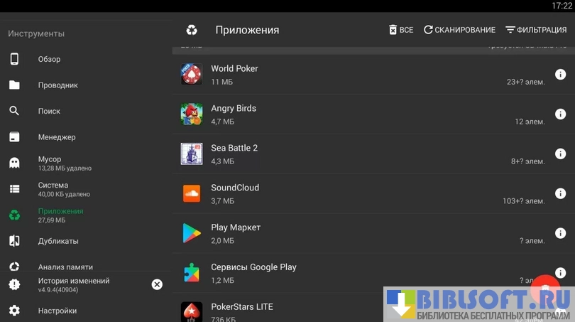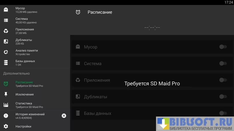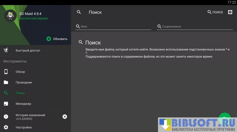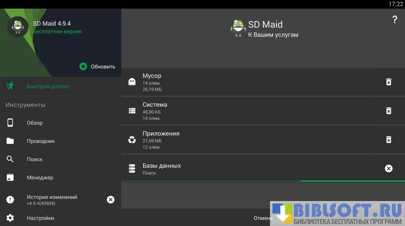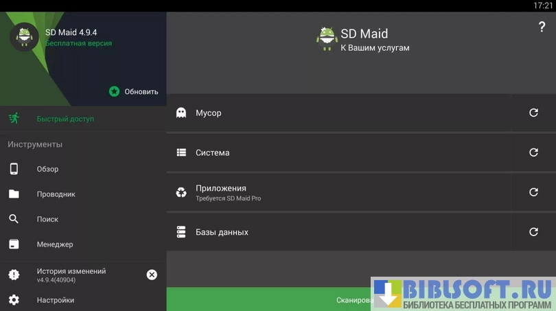 SD Maid - (очистка системы) представляет собой набор инструментов, который способен очистить устройство на базе Android от любых «мусорных» файлов: отчеты об ошибках, временные файлы и логи приложений. Полный функционал становится доступен на системах с установленным рутом, но многие полезные функции доступны и "чистым" устройствам.