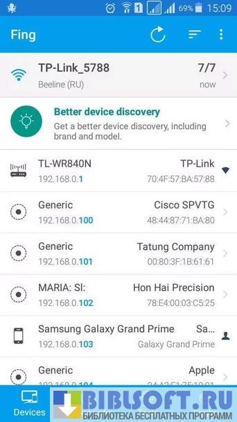 - демонстрация полного списка устройств и информации по ним (МАС-адрес, IP-адрес, имя устройства, марка производителя и многое другое);