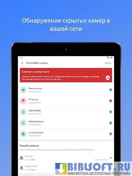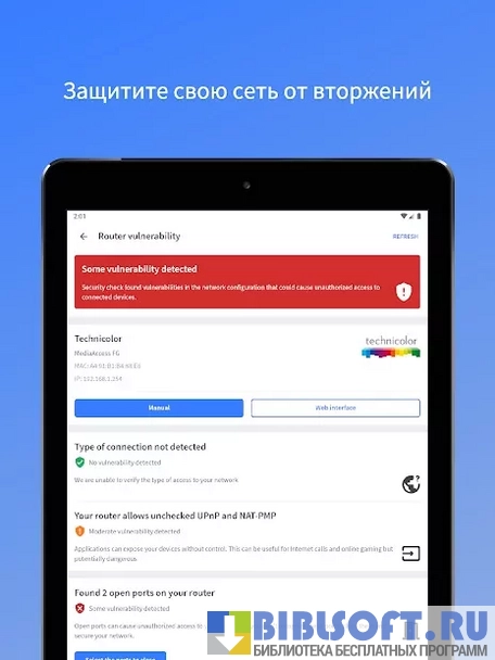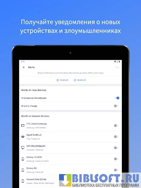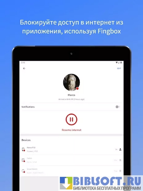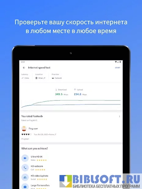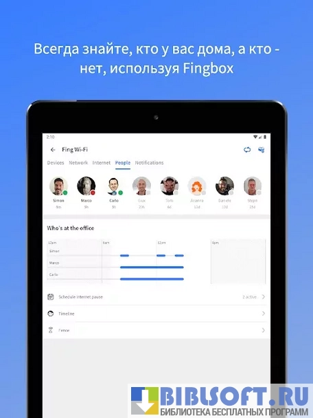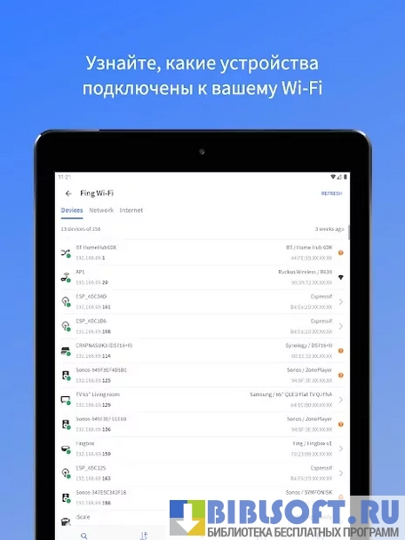 Fing — многофункциональная утилита для Android, предназначенная для управления домашней или корпоративной сетью Wi-Fi и контроля доступа к ней. Позволяет диагностировать состояние сети, уровень скорости, предоставляемой провайдером, список подключенных устройств. Дает возможность ограничения доступа определенным устройствам, оперативно уведомляет владельца о безопасности сети и изменении настроек.