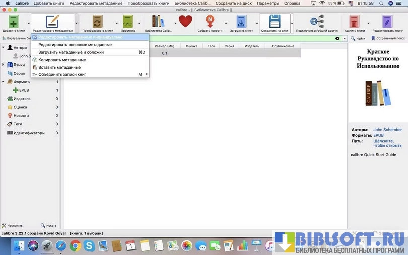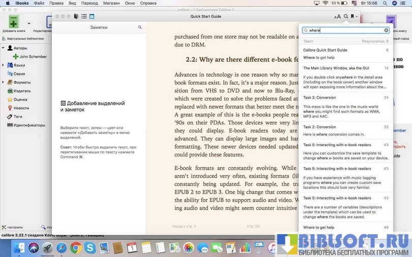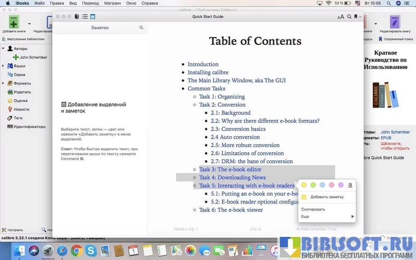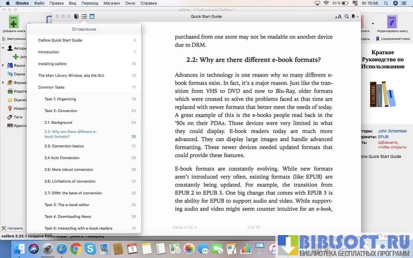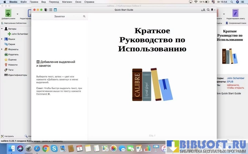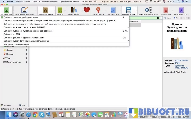 Calibre – симбиоз интерактивной библиотеки, виртуальной «читалки» и конвертера «книжных форматов» для macOS. Позволяет находить, загружать и категоризировать виртуальную литературу самой разной тематической направленности.