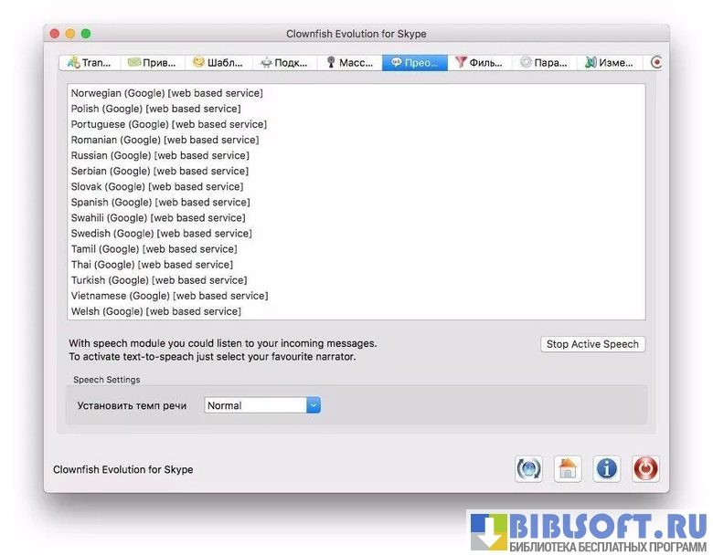 Инструмент Clownfish для Skype являет собой многофункциональное дополнение для Skype, существенно расширяющее его возможности. Можно изменять свой голос, преобразовывать текст в речь и организовывать широковещательные массовые рассылки текстовых шаблонных сообщений. На этом функции утилиты не ограничиваются, так как разработчики постоянно совершенствуют и расширяют ее функционал.