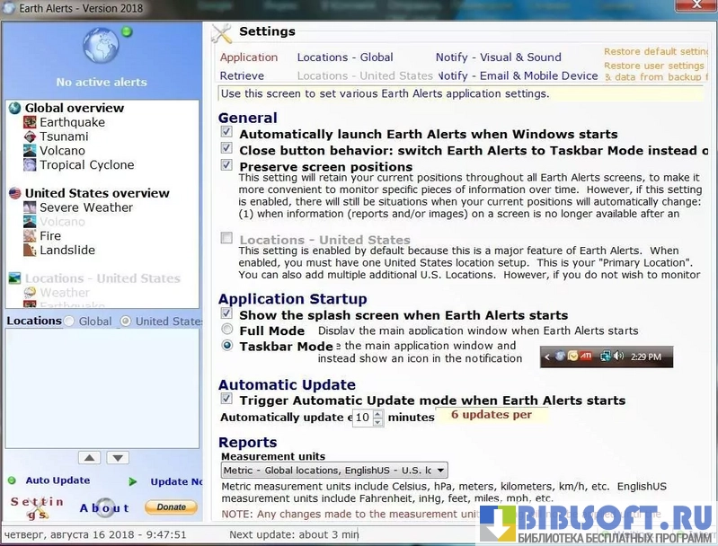 Earth Alerts – информационный-агрегатор для Windows, оповещающий пользователя о природных катаклизмах. Подгружает и визуализирует оперативную информационную сводку об актуальных природных катаклизмах планеты с различных онлайн сервисов, таких как - Геологическая служба США (U.S. Geological Survey), Национальная погодная служба США (National Weather Service), и Вашингтонский Смитсоновский институт (Smithsonian Institution) и т.п.