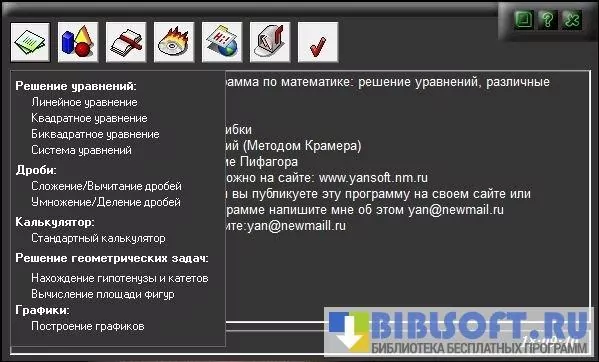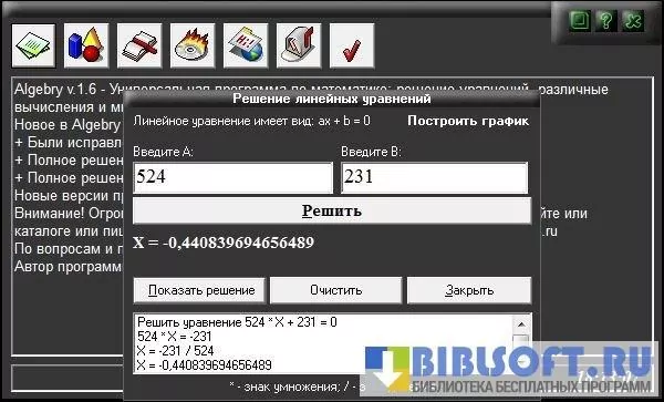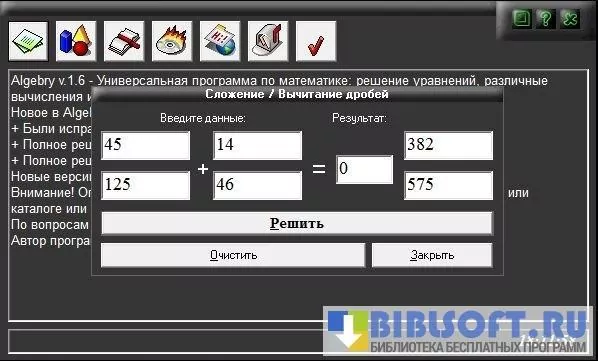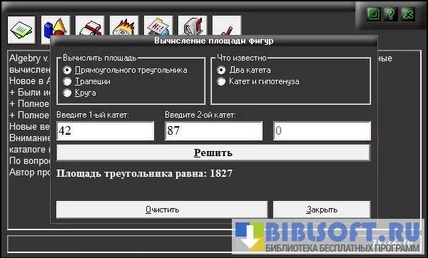 Algebry – визуализированный калькулятор математических функций и уравнений для Windows. Позволяет решать линейные, квадратные, биквадратные и связанные в систему уравнения и геометрические задачи. Умеет строить графики, вычислять численные характеристики (площадь, периметр и т.д.) геометрических фигур и определять значения тригонометрических функций их составных элементов.