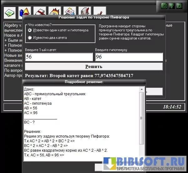 Выдает не только итоговое значение, но и подробное описание каждого этапа решения заданной задачи, со ссылками на соответствующие математические законы, теоремы и аксиомы. Визуализирует не только заданные в условии фигуры, но и графические обозначения каждого найденного элемента (напр. – рисует угол, синус которого нужно было определить). Оснащена несколькими визуальными темами и интегрированным графическим редактором тем - SkinEditor for Algebry.