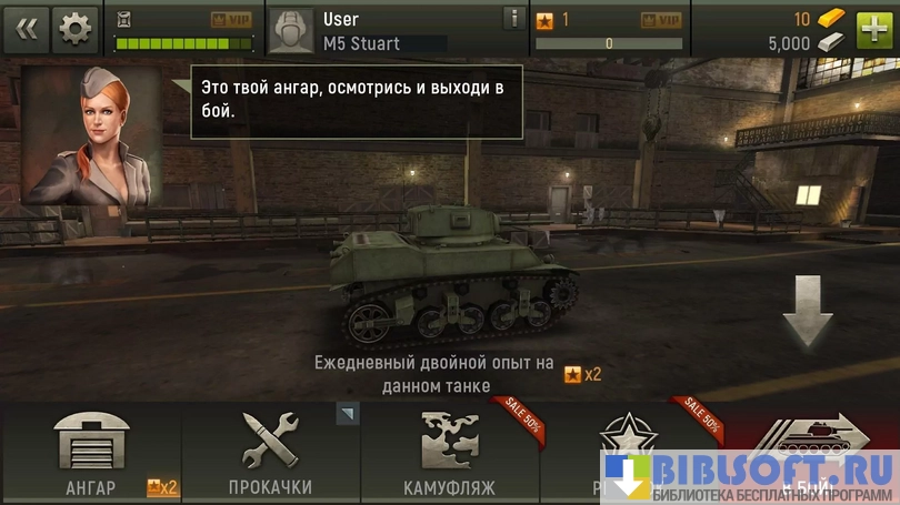 - Перегоняйте в ангар одну из доступных в начале игры боевых машин, изучайте её характеристики, рекрутируйте экипаж, выбирайте режим баталии и врывайтесь на поля сражений;