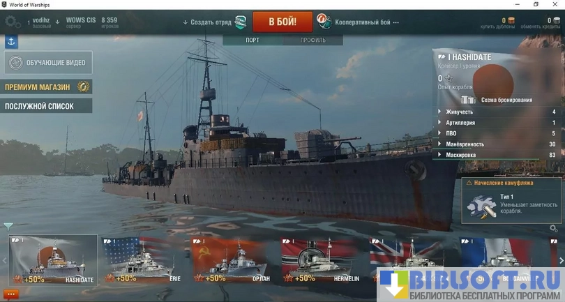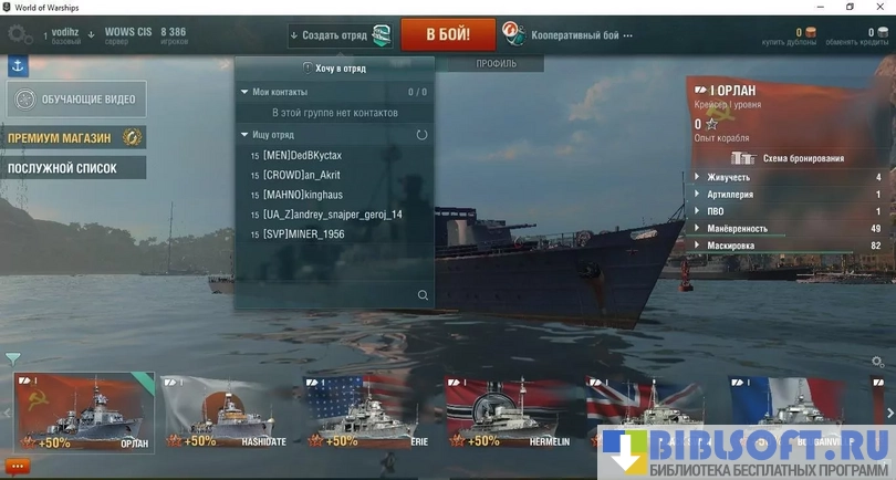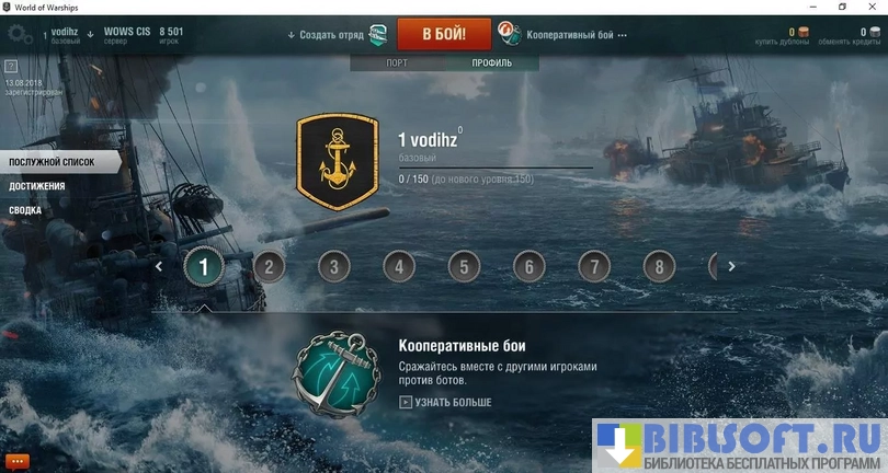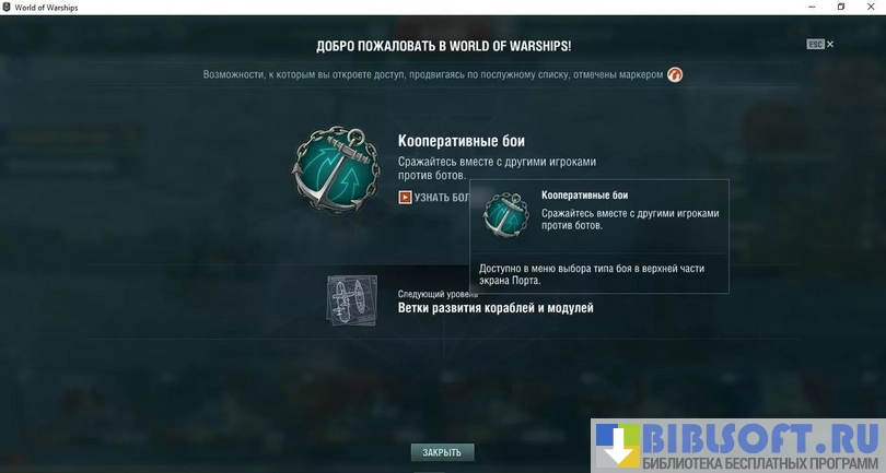 Для начала игры необходимо выбрать судно, тип боя и нажать кнопку “В бой!”. По умолчанию у всех новичков будет стоять тип Co-op - битва команды игроков против ботов. Подобные бои приносят меньше опыта и золота, но позволяют понять механику и разобраться в основах игры.