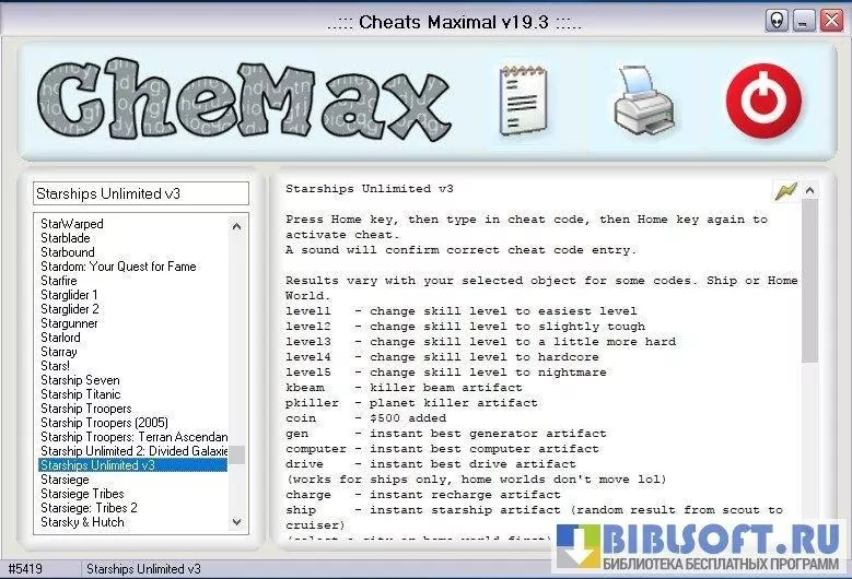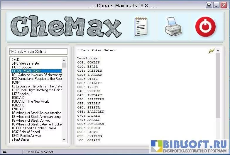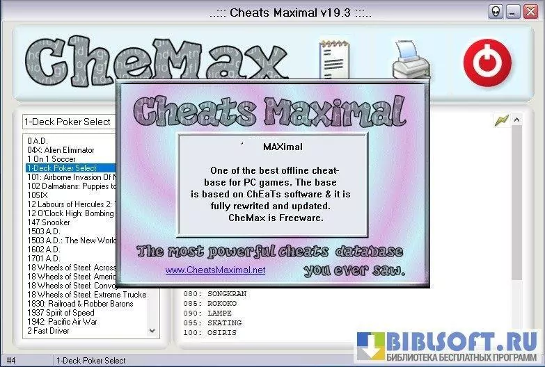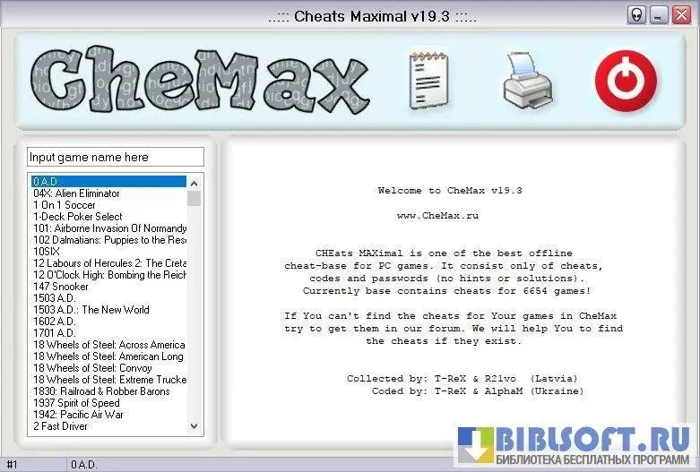 CheMax – инструмент для поиска чит-кодов для практически всех существующих компьютерных игр, исключая сетевые. На данный момент начисляет самою большую базу чит-кодов.