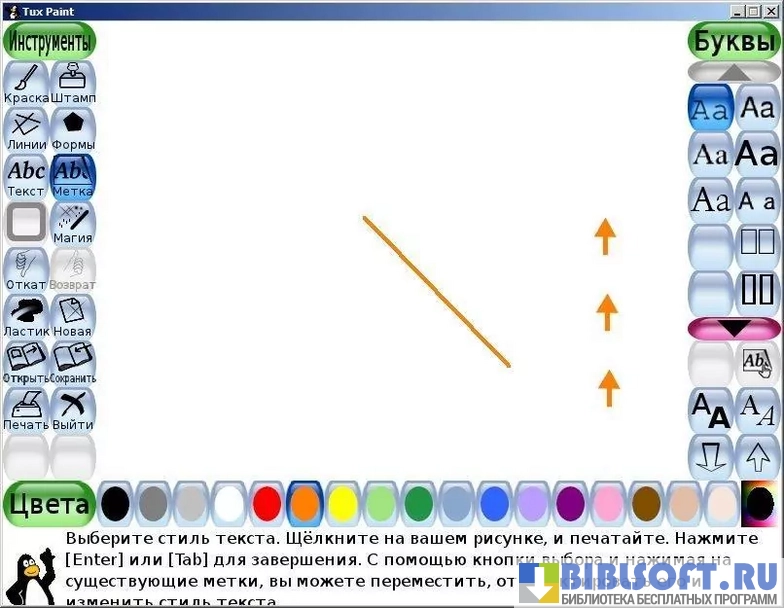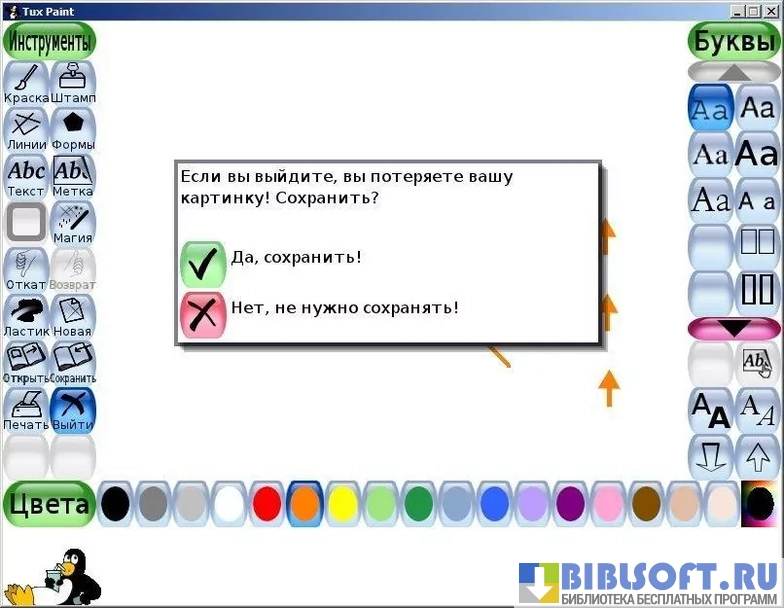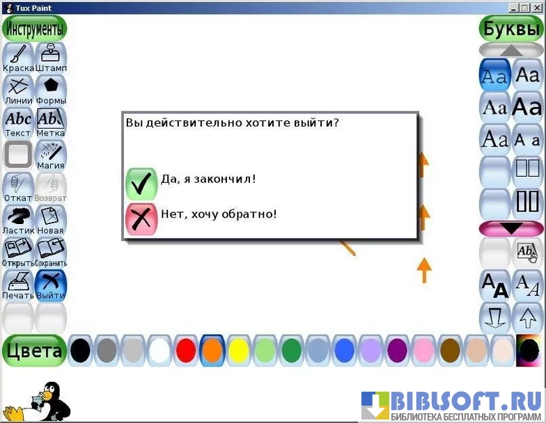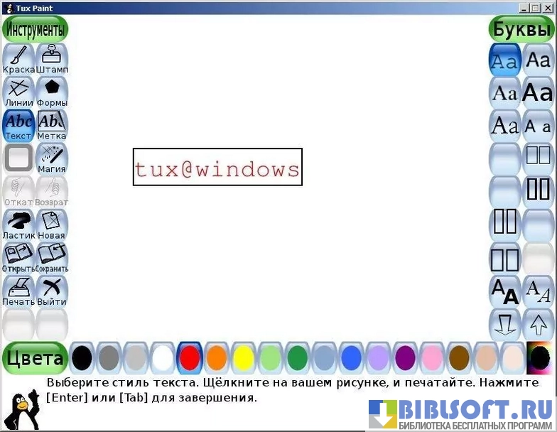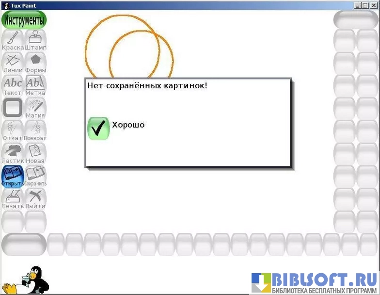 Интерфейс редактора Tux Paint оформлен в необычном и веселом стиле. Подсказки забавного пингвиненка Тукса помогут детишкам осваивать работу с программой. Все элементы имеют крупный размер и расположены таким образом, чтобы ребенок смог без усилий найти нужный ему инструмент и быстро разобраться с интерфейсом.