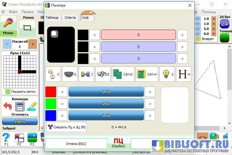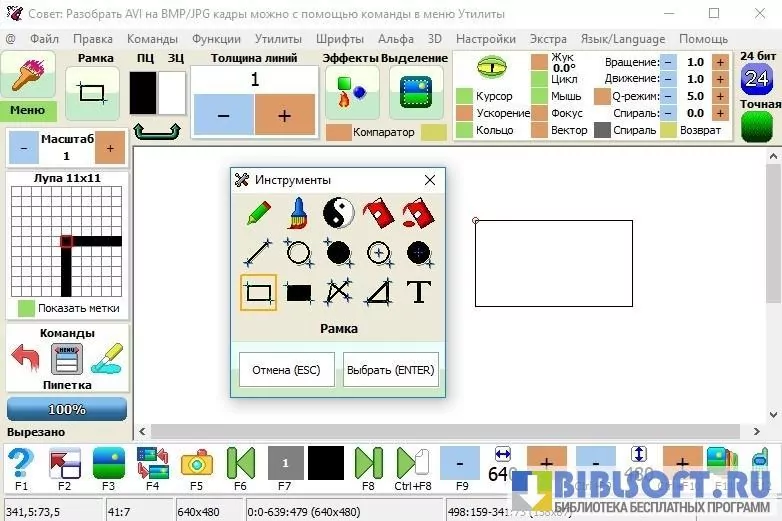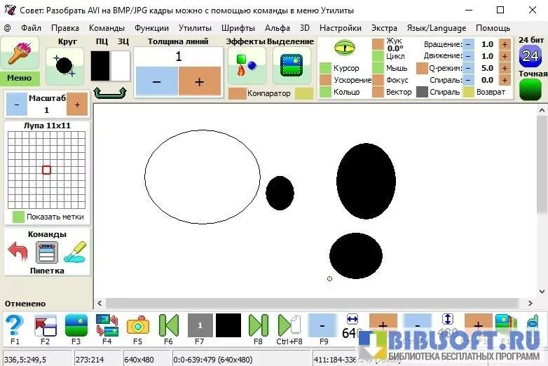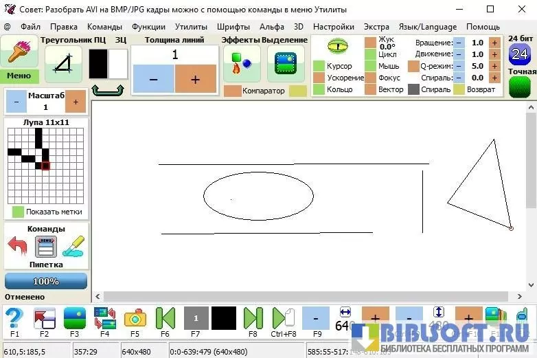 - Сохраняет результат обработки в виде графического файла, .pcf-шрифта, .gif-анимации или .avi-видео.