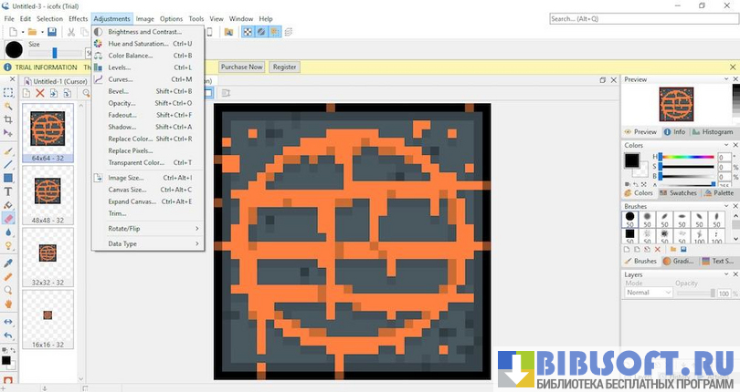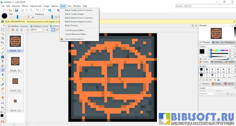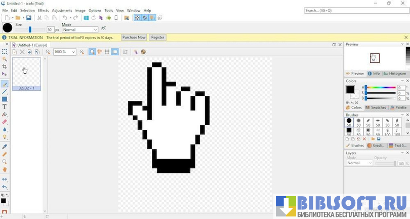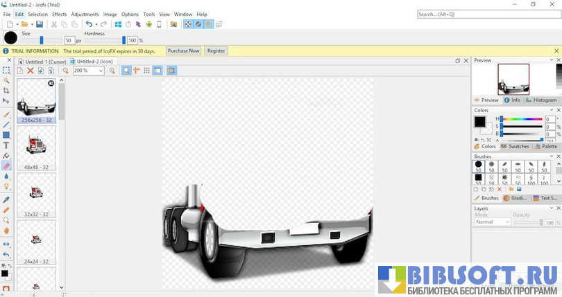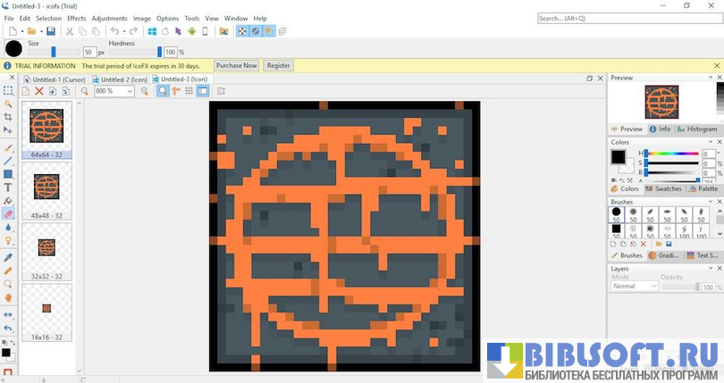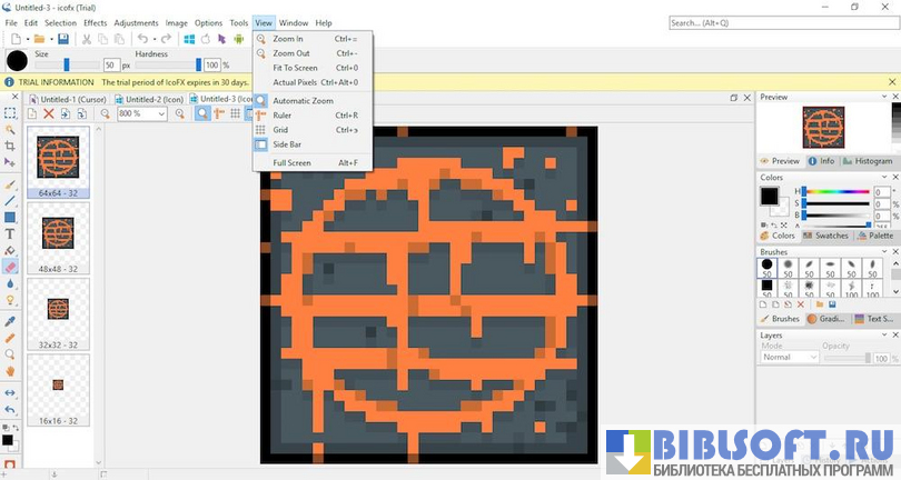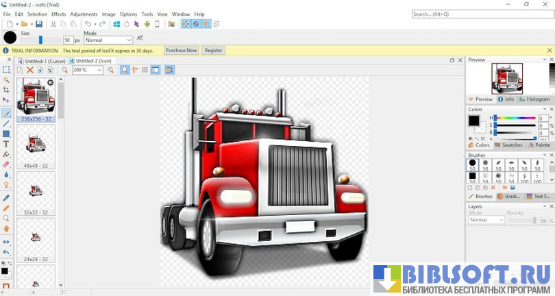 Чтобы получить возможность редактирования мельчайших деталей изображения, рабочую область IcoFX можно значительно увеличить (до невероятных 10000%). В процессе создания и изменения значков пользователь сможет работать одновременно с несколькими выбранными файлами.